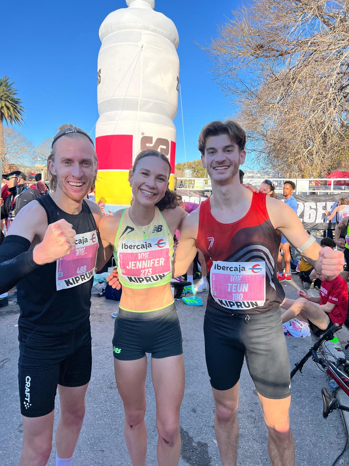 Op 5 kilometer zat ik op 0.14.09. Je krijgt dan tot 7 kilometer wat hoogteverschillen, maar de laatste drie kilometer naar de finish dalen weer. Op 8 kilometer moest ik nog een flinke sprong maken om een vóór mij vallende atleet te ontwijken, maar ik heb mij niet meer af laten leiden. De laatste 2 kilometer was geweldig: we stormden in een groepje naar de finish. En daar zag ik dat ik zelfs nog één seconde onder de limiet voor het EK in Birmingham zat, ongekend!”